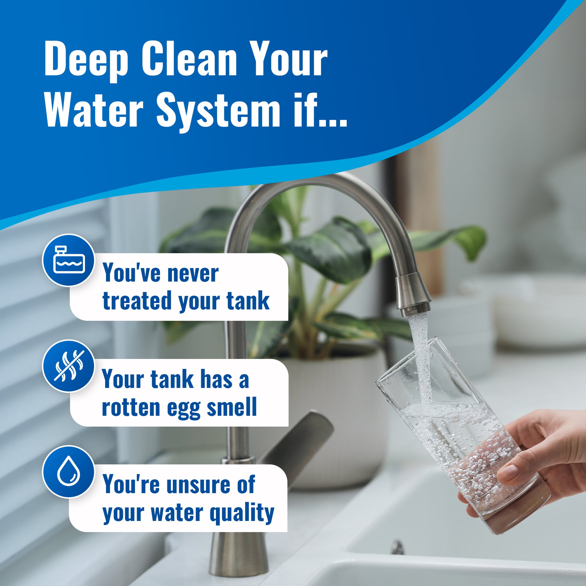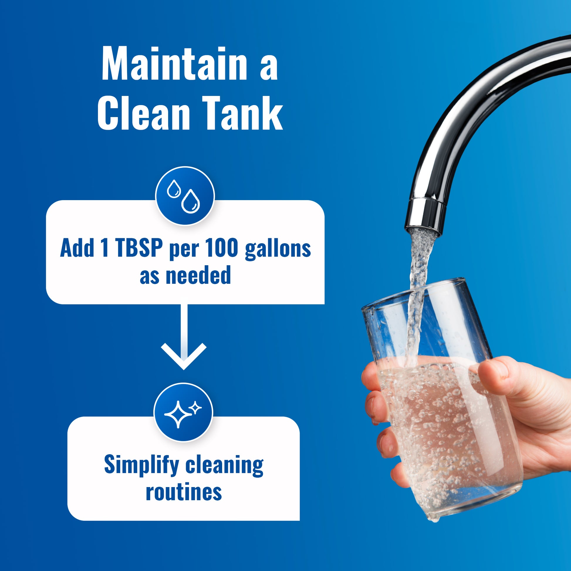 Keep your tanks clear - Once your tanks are clean, continue to use a lower dose of 1 TBSP per 100 gallons to maintain your system and prevent deposit build up that causes stale tastes and odors.
